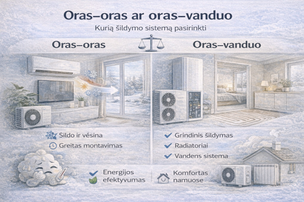 Renkantis šildymo sistemą dažnai kyla klausimas – oras–oras ar oras–vanduo šilumos siurblys. Straipsnyje paaiškiname pagrindinius skirtumus, privalumus ir kada kuri sistema tinka geriausiai.