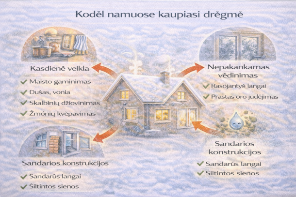 Drėgmės perteklius patalpose dažniausiai atsiranda dėl nepakankamo vėdinimo, kasdienės veiklos ir sandarių pastatų konstrukcijų. Suprasdami pagrindines drėgmės kaupimosi priežastis galime lengviau išvengti rasojančių langų, nemalonaus kvapo ar pelėsio atsiradimo.