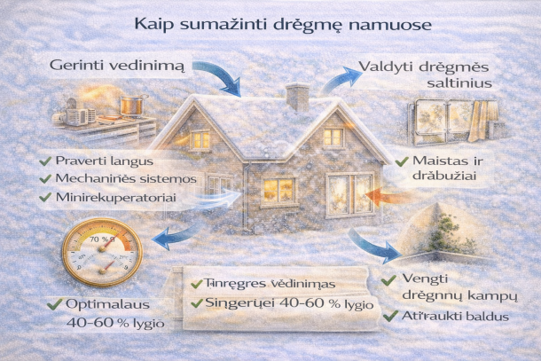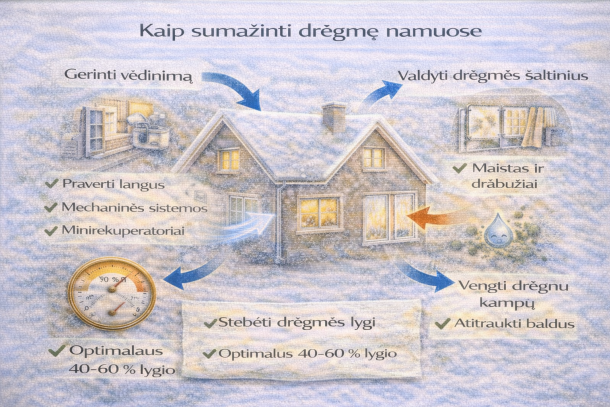 Per didelė drėgmė namuose gali sukelti rasojančius langus, nemalonų kvapą ir pelėsio riziką. Straipsnyje aptariame pagrindinius būdus, kaip sumažinti drėgmę patalpose ir pagerinti namų mikroklimatą
