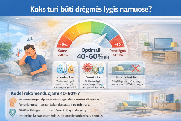Per didelė arba per maža drėgmė patalpose gali turėti įtakos komfortui, savijautai ir patalpų būklei. Straipsnyje aptariame optimalų drėgmės lygį namuose ir kaip jį padeda palaikyti tinkamas vėdinimas.