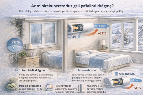 Drėgmės perteklius namuose gali sukelti kondensatą, pelėsį ir prastą mikroklimatą. Šiame straipsnyje paaiškiname, kaip minirekuperatoriai padeda sumažinti drėgmę patalpose ir kodėl svarbu pasirinkti įrenginį, pritaikytą vietos klimato sąlygoms.