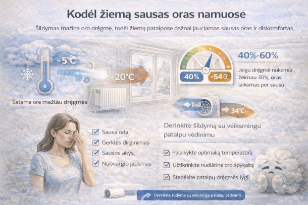 Žiemą daugelis žmonių pastebi, kad namuose oras tampa labai sausas. Straipsnyje paaiškiname, kodėl taip nutinka ir kaip išlaikyti komfortišką mikroklimatą šildymo sezono metu.